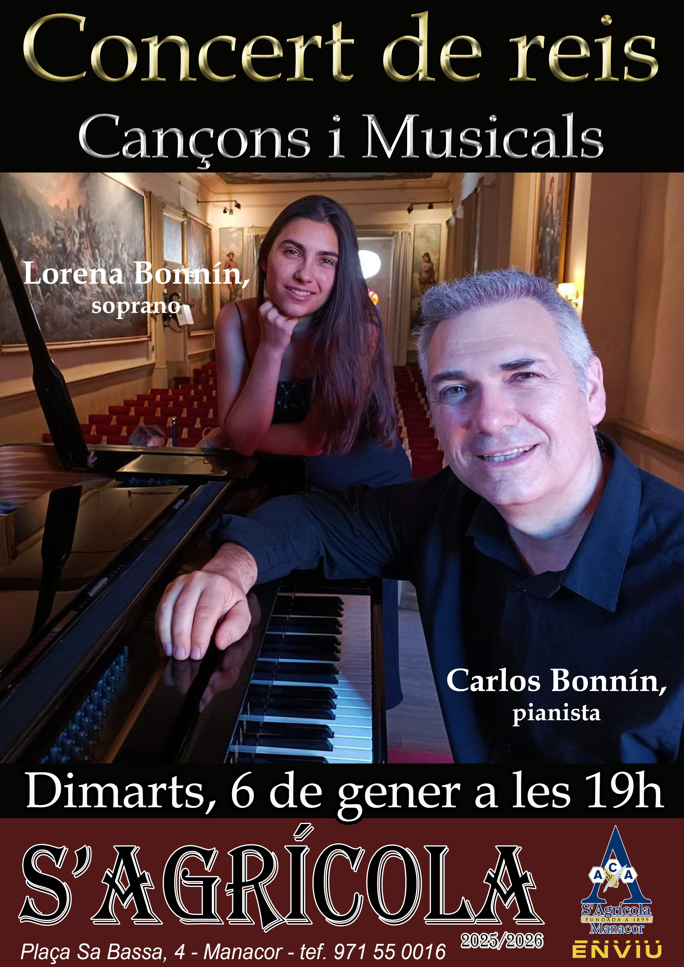 Dimarts, 6 de gener d’aquest recentment estrenat 2026, a les 19h s’Agrícola, com cada any per aquestes dades, oferirà un concert de música clàssica en commemoració de la festivitat dels Reis Mags. El pianista i compositor Carles Bonnin i la seva filla, la joveníssima soprano i oboista Lorena Bonnin en seran els protagonistes.