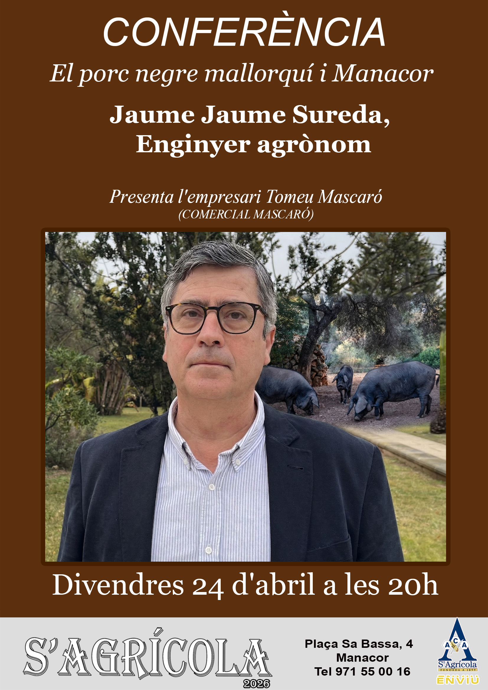 El proper divendres dia 24 d’abril a les 20 hores el doctor Jaume Jaume Sureda donarà una conferència a s’Agrícola titulada «El porc negre mallorquí i Manacor». Presentarà el conferenciant l’empresari Tomeu Mascaró.