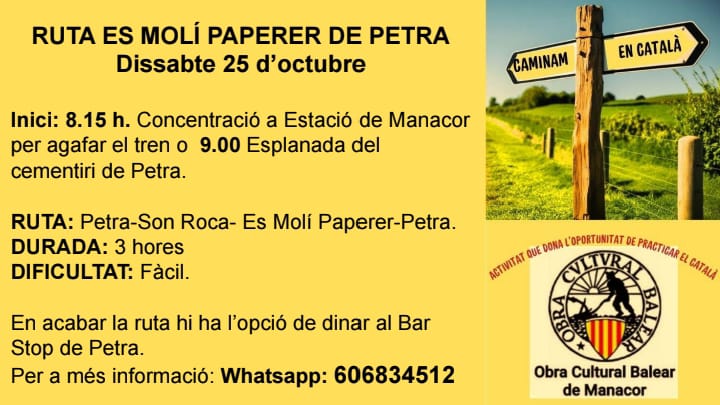 Voleu anar d’excursió? Aquest dissabte, excursió organitzada per l’OCB de Manacor pels voltants de Petra. Excursió fàcil, de 3 horetes i oberta a tothom.