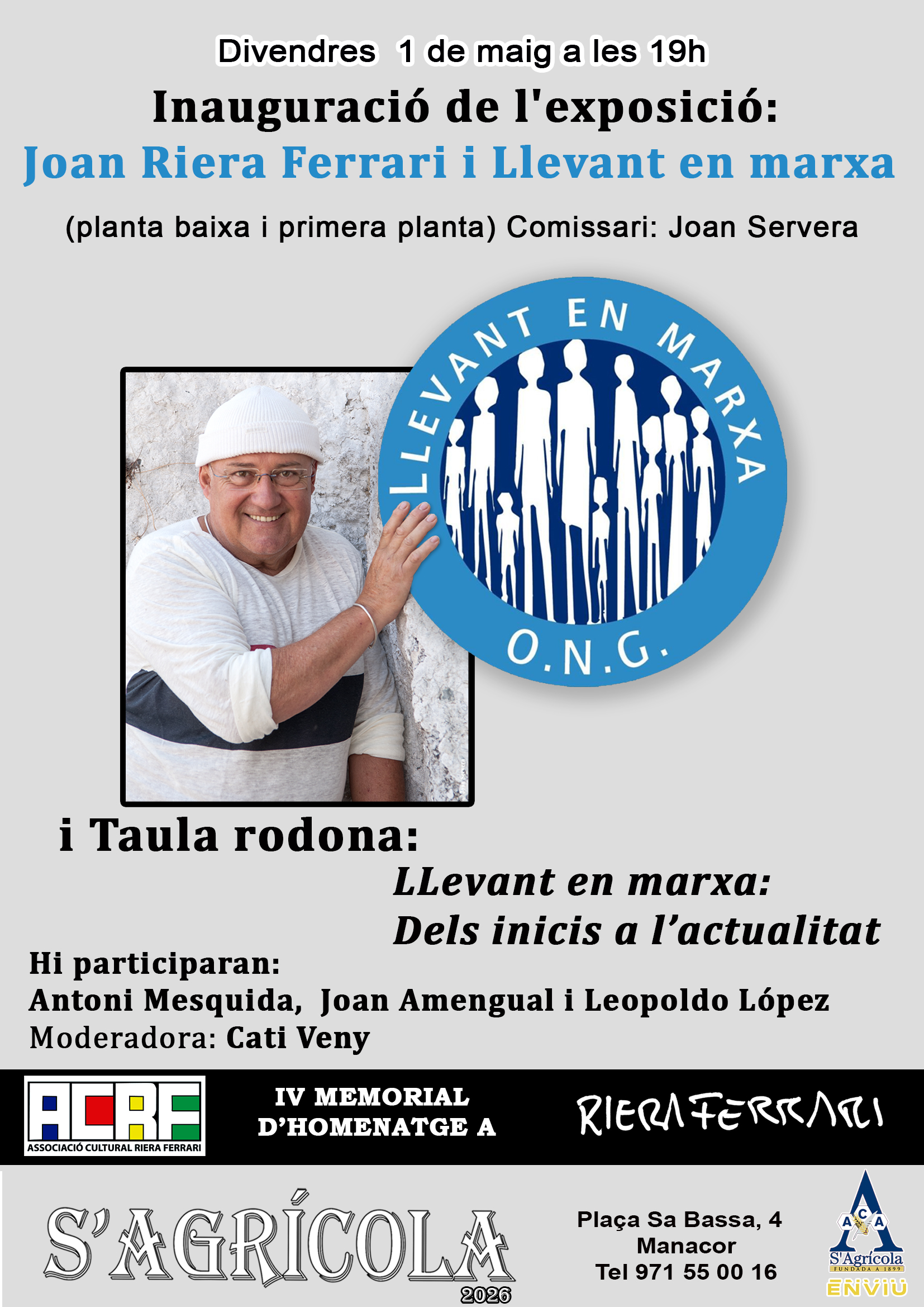 IV MEMORIAL D'HOMENATGE A JOAN RIERA FERRARI De l'1 al 4 de mig de 2026, a l'Associació Cultural S'Agrícola Per quart any consecutiu, l'Associació Cultural Riera Ferrari organitza un memorial per tal de retre homenatge a la figura del pintor Joan Riera Ferrari. Els actes commemoratius s'inicien el proper 1 de maig de 2026 amb una doble proposta. A les 19h a S'Agrícola, s'inaugurarà l'exposició Joan Riera Ferrari i Llevant en marxa amb un seguit de fotografies i altres elements representatius. L'exposició, comissariada per Joan Severa, ocuparà la planta baixa i la primera planta de l'edifici de l'Associació Cultural S'Agrícola. A continuació en durà a terme una Taula rodona Llevant en marxa: dels inicis a l'actualitat amb la participació d'Antoni Mesquida, Leopoldo López i Joan Amengual que moderarà la periodista Cati Veny.llevant en marxa.jpg1.32 MB